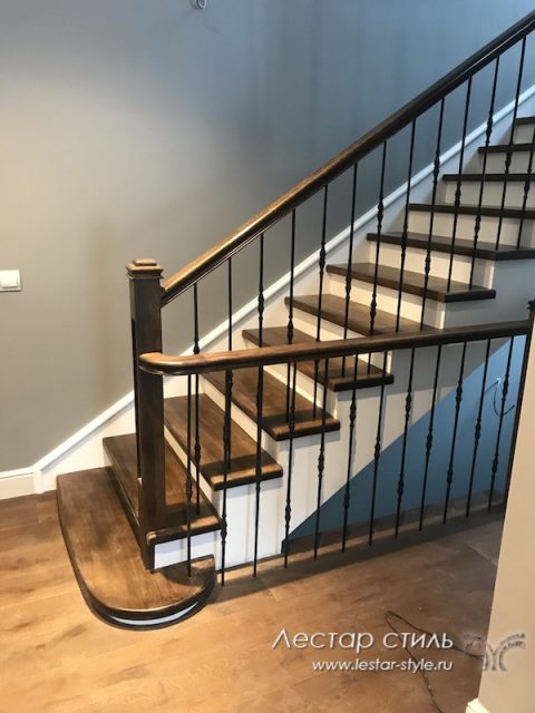 Бетонная лестница облицована дубовыми ступенями , подступенки и панели по стене сделаны из мдф и покрашены прочной эмалью , Ограждение выполнено из кованых балясин и деревянного поручня Цвет ступеней подбирается по образцу цвета пола , чтобы создать единую цветовую гамму для всего интерьера. Кованые балясины и деревянный поручень придают лестнице элегантный и традиционный вид. Прочная…